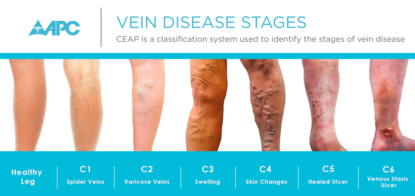 Skin changes can occur during many stages of venous disease. Swelling may occur around the leg, ankles, or around the knees. Brown discoloration that appears as a stain on the skin is a sign of an advanced stage of venous disease. This occurs as a result of blood leaking from the blood vessels and into the skin tissue. This staining can lead to white spots and are a precursor to an ulcer.